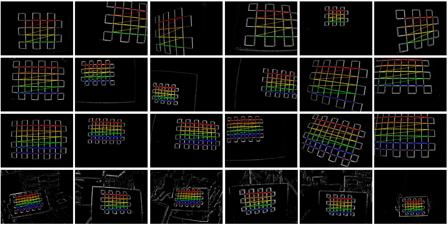 We show that our method can reliably detect checkerboard corners under various grid sizes, board poses, and cluttered backgrounds. The detected corners are refined toward low event-density regions, achieving sub-pixel accuracy.