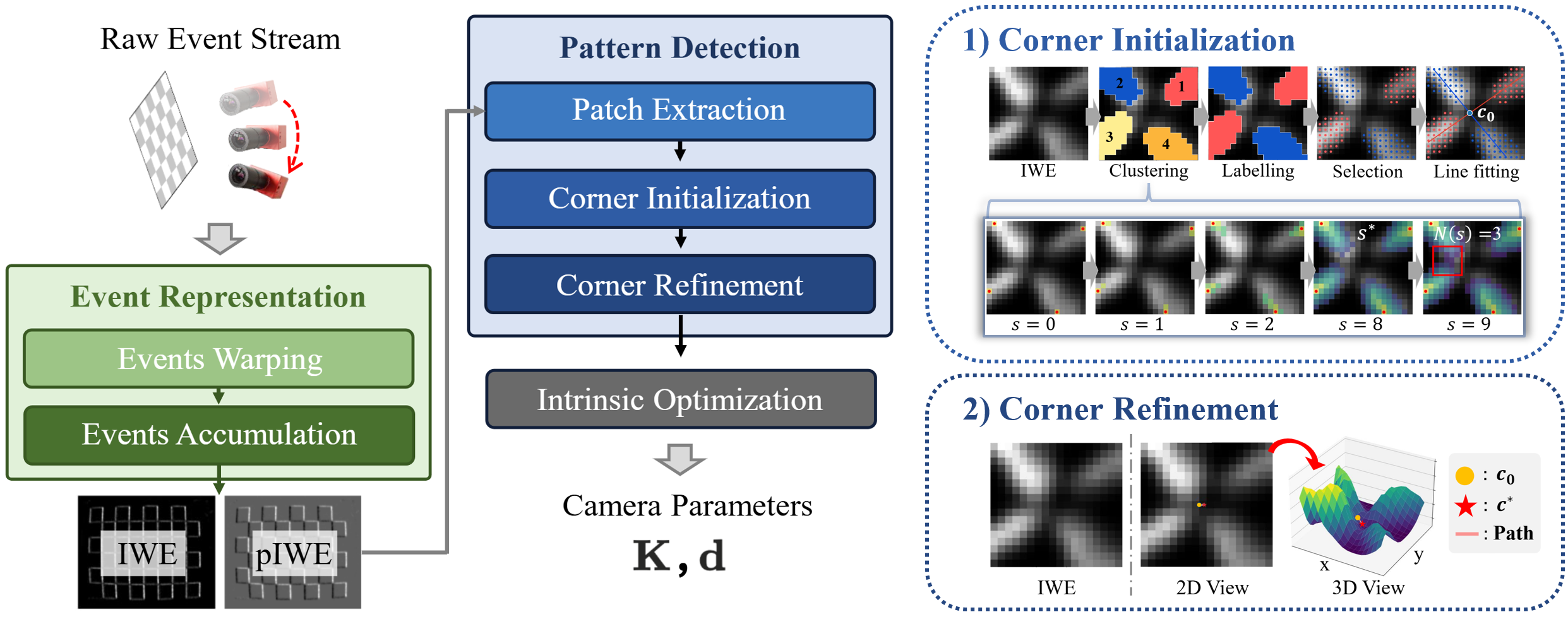 We first convert raw event steam into an IWE (Image of Warped Events) by warping events along motion vector. Given IWE, we initialize checkerboard corners by leveraging reliable edge cues, and then refine them toward the local minimum of event density to obtain sub-pixel accuracy. The refined corners are fed into the batch optimization process to estimate the camera parameters. Moreover, we show that our framework generalizes to other fiducial markers, such as AprilTags, allowing for robust tag identification even under partial occlusion