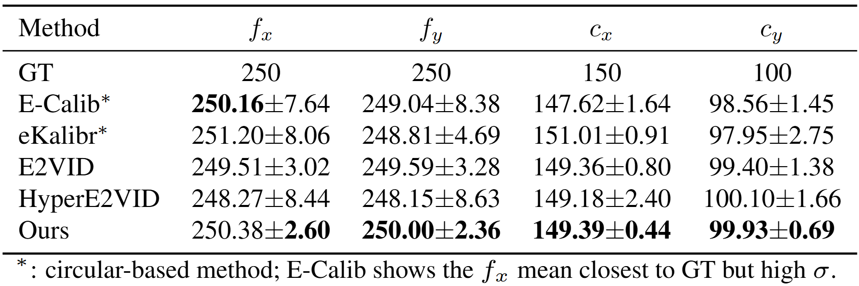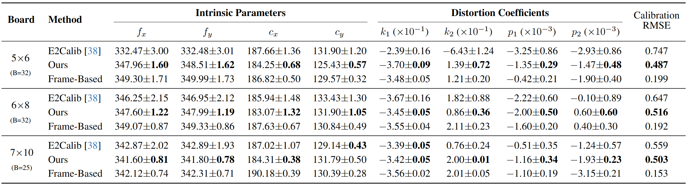 We evaluate our method on self-collected real-world data. Since there are no ground truth camera parameters in real-world scenarios, we evaluate calibration stability by measuring the standard deviation of the estimated camera parameters across multiple trials. Our method demonstrates higher calibration stability than E2Calib, which reconstructs grayscale images using E2VID and detects corners using OpenCV. Notably, our method achieves performance comparable to frame-based calibration, which we use as pseudo ground truth.